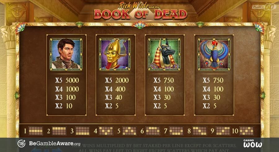 The gold Book of Dead symbol plays the part of the Wild symbol and completes all winning pay lines.